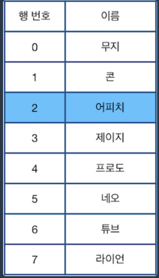 - 위 표에서, 파란색 칸은 현재 커서의 위치를 의미합니다. 커서는 위, 아래로 이동할 수 있고 커서가 있는 행을 삭제할 수 있습니다.